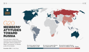Las posiciones de los miembros del G20 sobre la guerra difieren notablemente. EEUU y la mayoría de sus aliados en el Grupo han impuesto sanciones a Moscú y han votado para condenar la invasión en la Asamblea General de la ONU. La mayoría de los demás miembros han condenado al menos en la ONU la agresión y los esfuerzos ilegales de Rusia por anexionarse territorio ucraniano, pero no han recurrido a las sanciones (véase el mapa). Sin embargo, tres miembros no occidentales de peso del G20 —China, India y Sudáfrica— no sólo se han negado a imponer sanciones a Rusia, sino que se han abstenido en las votaciones de la ONU sobre la guerra.