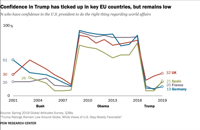La desconfianza mutua viene de lejos. En 2007, en siete países europeos (Francia, Alemania, Italia, Polonia, España, Suecia y Reino Unido) solo el 21% confiaba en que Bush haría lo correcto en asuntos internacionales, el mismo porcentaje que en 2019 dijo lo mismo sobre Trump.