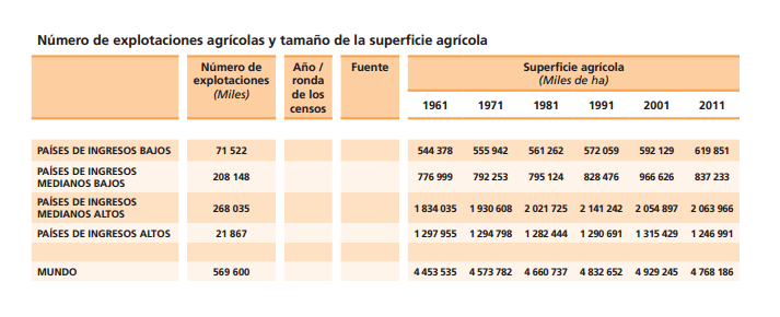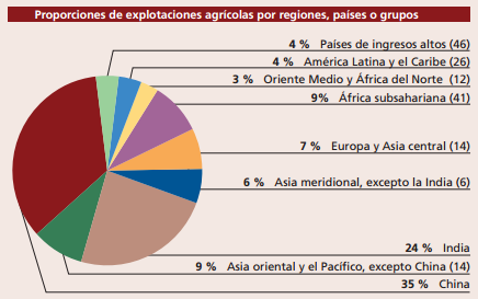 La mayor parte de las explotaciones agrícolas se encuentran en Asia, principalmente en China e India, que representan el 59%. En África subsahariana solamente se encuentran un 9% de las granjas del mundo, y en Europa y Asia central, un 7%. Menos aún en América Latina y el Caribe (4%).