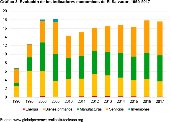 En el ámbito de la presencia económica de El Salvador en 2017, destacan los servicios con el 21,7% de la presencia global del país, seguidos de las manufacturas (16,8%) y los productos primarios (7,3%). El peso del sector servicios en la presencia exterior salvadoreña se explica por la relevancia del sector bancario nacional en la prestación de servicios en los países de la región, convirtiendo a El Salvador en uno de los centros financieros de Centroamérica; así como por los servicios relacionados con el turismo. El comercio del país ha vivido una clara evolución en las últimas décadas, con una pérdida de importancia del que tradicionalmente fue el principal producto exportado por El Salvador, el café; y un destacado desarrollo del sector manufacturero, con la industria textil como su principal estandarte. En términos de peso sobre el total de las exportaciones de bienes, el café ha pasado de suponer un 31% en 1995 a un 2% en 2016, mientras que los artículos de ropa pasaron del 8% al 23% en el mismo periodo. En el gráfico 3 podemos ver la evolución de los indicadores económicos, con una caída de los productos primarios a partir de 1995 frente a un ascenso y mantenimiento de las manufacturas y los servicios.