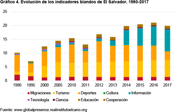 Con respecto a la presencia blanda, que aporta el 29,6% de la presencia global de El Salvador en 2017, las principales variables serían la de información (13,7%) y turismo (8,4%). El sector turístico presenta un gran dinamismo en el país, al igual que sucede en varios países de Centroamérica. Sin embargo, en el índice podemos apreciar un ligero retroceso de este sector en los últimos años. El indicador de información, por su parte, crece en los últimos años, dado el desarrollo de la infraestructura necesaria para la difusión de internet por el territorio nacional.
