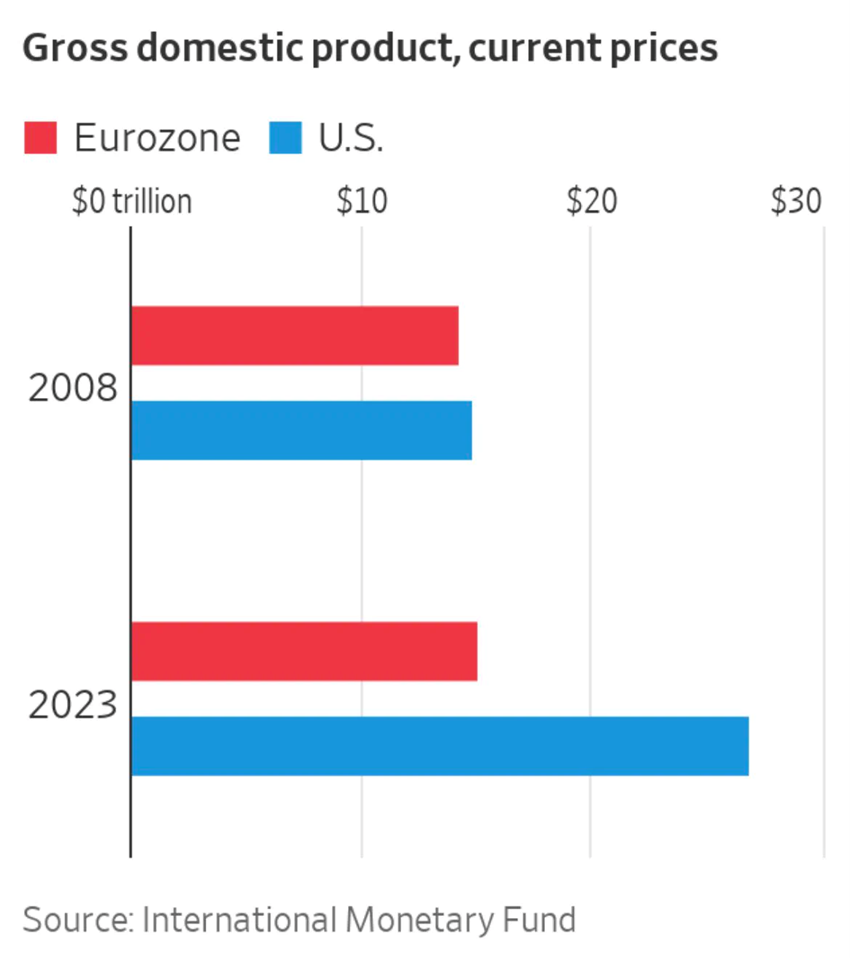 En 2008 la economía de la UE era más o menos equivalente a la de Estados Unidos. Hoy, la de EEUU es el doble de grande que la de la UE. Europa no ha sabido gestionar la que fue para ella la larga crisis que empezó, en Wall Street en 2008. En la recuperación el ciudadano medio estadounidense se ha enriquecido, mientras el europeo se ha empobrecido. La propia secretaria del Tesoro de Estados Unidos, Janet Yellen, lo dice abiertamente: “»A la mayor parte de Europa le va peor que a Estados Unidos”.