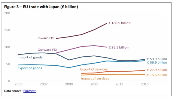 En 2015, Japón era el sexto mercado de destino para las exportaciones europeas y el séptimo mayor proveedor de importaciones en la Unión. Sin embargo, aunque las exportaciones de bienes europeos a Japón han aumentado en términos absolutos, la participación de Japón en el comercio de bienes de la UE está disminuyendo. En el pasado, Japón se benefició de un superávit comercial con la Unión, pero en la actualidad esa tendencia se ha invertido. Esto no significa una disminución de los intereses compartidos, ya que en los últimos años estos se encuentran al alza: como potencias avanzadas e industrializadas, la UE y Japón tienen muchos intereses comunes y colaboran de forma cercana en foros internacionales y multilaterales. Ante la posibilidad de un acuerdo, ha de tenerse en cuenta que ambas regiones, unidas conformarían el 40% del comercio mundial total, además de representar el 30% del PIB y suponer el 10% de la población del planeta, lo que dotaría a la alianza de una enorme fuerza.