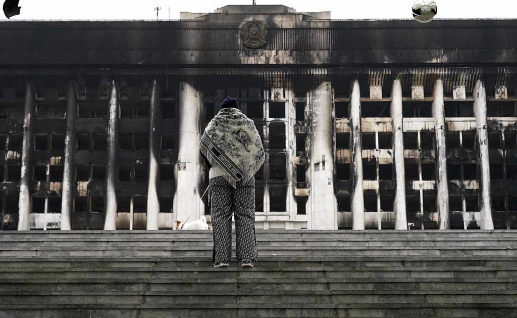 En Almaty, la multitud asaltó tiendas de armas y supermercados, cajeros automáticos, incendió coches y se apoderó de vehículos militares blindados. También asaltaron el edificio de la administración local, la fiscalía, el edificio del Comité de Seguridad Nacional, los estudios de televisión y otros lugares, y muchos quedaron destruidos o quemados. El aeropuerto de Almaty también fue ocupado durante varias horas. Las pruebas disponibles hasta ahora sugieren que los manifestantes armados no tenían objetivos estratégicos más allá del caos y el saqueo: los edificios administrativos fueron quemados y saqueados, pero nadie intentó retenerlos después. Los alborotadores tampoco plantearon ninguna reivindicación política. La falta de un liderazgo centralizado de las múltiples bandas y la ausencia de una agenda política que no fuese el caos son la clave en este caso, pero también influyeron las décadas de represión de la oposición por parte del gobierno kazajo.