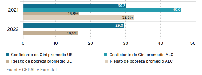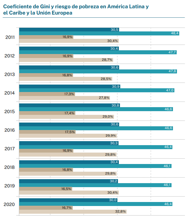Uno de los problemas estructurales que caracteriza a América Latina y el Caribe es la desigualdad. Pese a disponer de recursos naturales de gran valor y de un importante capital humano, la brecha social en el interior de los países de la región se encuentra entre las más altas del mundo, como muestra el índice de Gini que mide la desigualdad y que señala valores de 0,4581 frente a los 0,296 de los países de la Unión Europea. La pandemia y los efectos de la crisis socioeconómica que generó –y que aún se están superando– agudizaron la situación, pero se trata de un problema previo arraigado en las estructuras sociales y económicas.