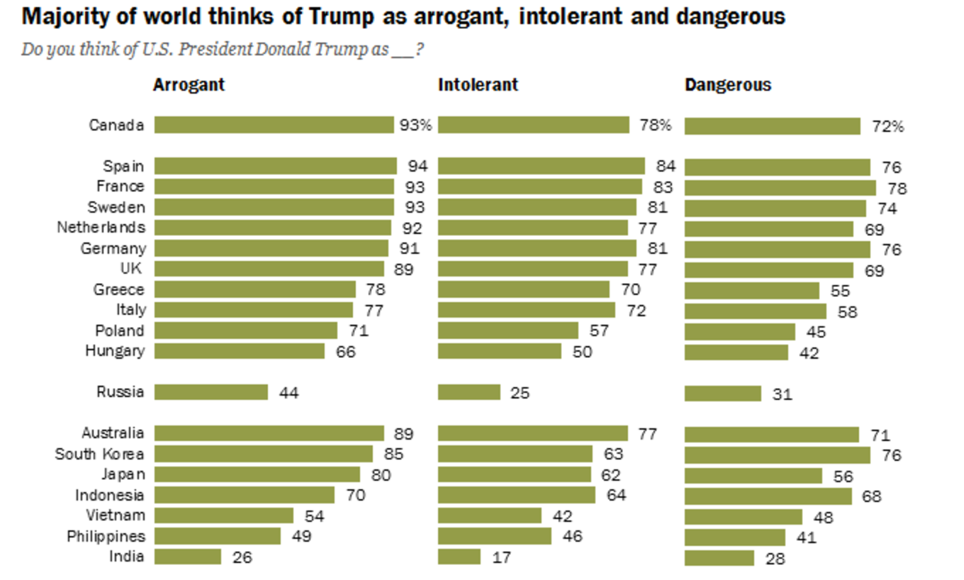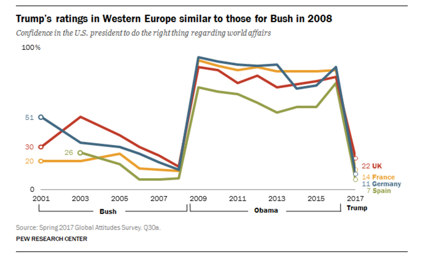 Hasta ahora, la diplomacia alemana no ha logrado coagular ningún bloque centrista para aislar a EEUU. Aunque la elección de Trump parece haber reforzado al eje franco-alemán, abundan los países occidentales que no desean contrariar a la Casa Blanca. Entre ellos están el propio Trudeau, la británica Theresa May y el gobierno español. El antiamericanismo pasivo de España se traduce en una de las valoraciones más negativas del presidente estadounidense que, sin embargo, no obtiene representación a nivel institucional.