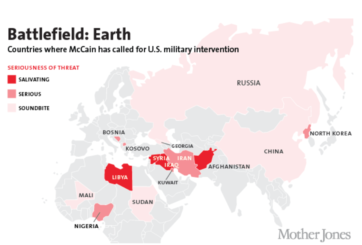 Si la carrera de McCain destacó por algo, fue su apuesta constante por el militarismo. Aunque se opuso con valor al régimen de tortura que inauguró Bush, McCain jamás encontró una guerra que le desagradase. Exigió intervenciones militares en Afganistán, Irak (tanto en 1990 como en 2003, si bien terminó por reconocer la segunda como un error), Libia, Siria, Georgia, Yemen, Corea del Norte y Ucrania –donde se personó para promover las protestas contra Viktor Yanukovich, posando junto a políticos de extrema derecha–. Entre esta larga lista, Irán destaca como su Moby Dick. Una ballena blanca a la que McCain perseguiría con pasión e irresponsabilidad, incitando a bombardear el país al ritmo de los Beach Boys.