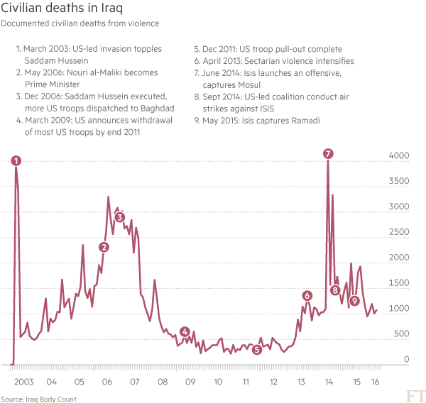 Fuera de sus fronteras, los representantes iraquíes alardean de un país con una democracia completa y políticamente estable. Sin embargo, Irak ocupa los últimos puestos en la mayoría de índices internacionales, su tradición sectaria sigue bloqueando posibles avances en el terreno político y el terrorismo islámico pone a prueba una reconstrucción a base de parches. En 2003, Irak fue la segunda parada de Estados Unidos en su guerra contra el terror. Su retirada ocho años después dejaba detrás una guerra contraria al Derecho Internacional, 100.000 civiles muertos y un proceso de nation-building fracasado. En 2013, los índices de violencia volvieron a situarse al nivel de 2008 y desde entonces no han descendido.