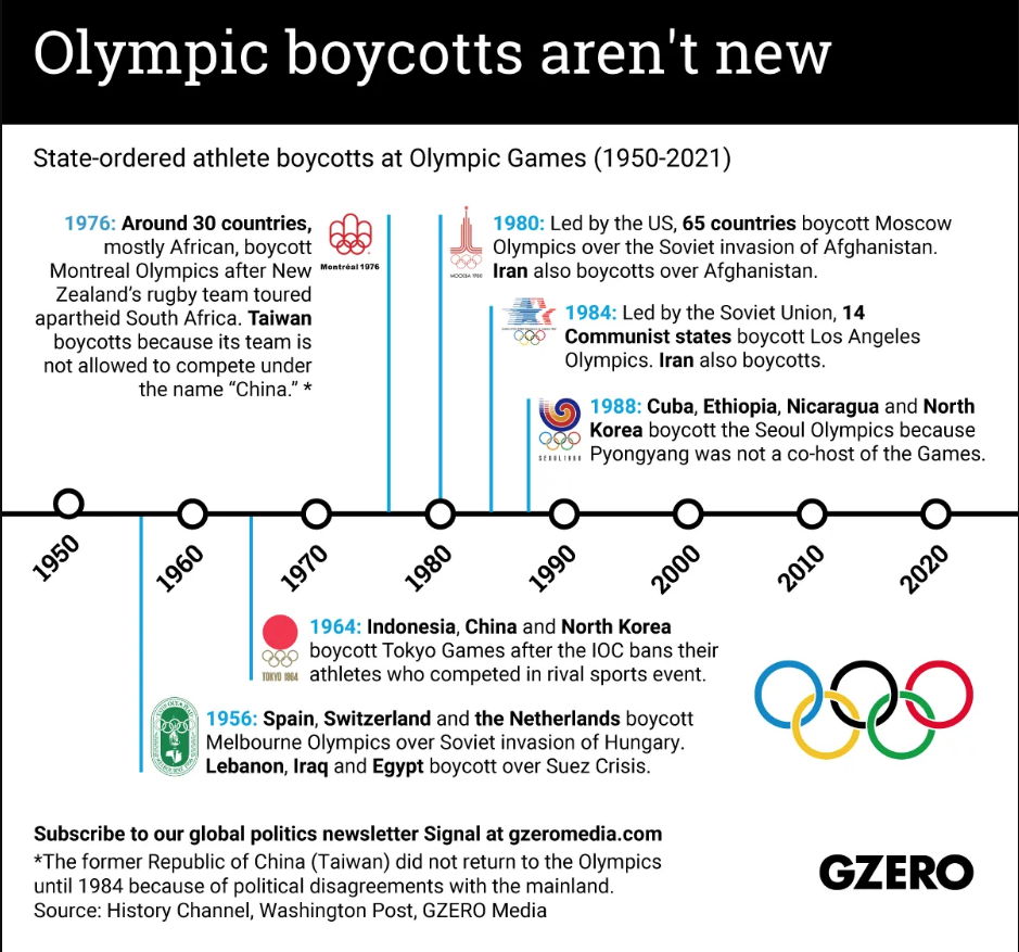 Como muestra el gráfico de GZERO, el boicot es una disciplina olímpica con una larga tradición. En los JJOO de Berlín, los atletas alemanes judíos fueron vetados, contraviniendo los principios del olimpismo de no discriminación y respeto por la dignidad humana. Varios comités olímpicos nacionales se plantearon no asistir, entre ellos el de EEUU. Al final, la mayoría optó por participar. El atleta estadounidense Jesse Owens se encargó de aguar la fiesta desde dentro, con sus cuatro medallas de oro; desde fuera, la tarea recayó en la Unión Soviética y en la España del gobierno del Frente Popular. Los alemanes, no obstante, acabaron triunfando –con permiso de Owens–, cosechando el mayor número de medallas.