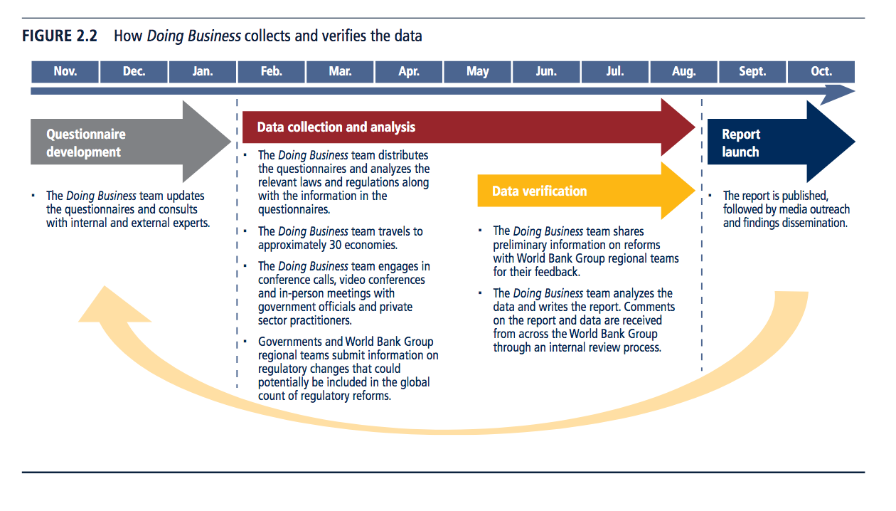 El objetivo del Doing Business es informar sobre el entorno regulatorio de cada Estado miembro, entre cuyos elementos figuran los procedimientos legales, los tiempos de espera, los costos de lanzamiento, la eficiencia del sistema judicial y la accesibilidad y fiabilidad de servicios básicos como la electricidad. Estos y otros muchos factores determinaban la clasificación general de cada país. En el informe de 2018, por ejemplo, Nueva Zelanda ocupaba el primer lugar y Somalia, el último.