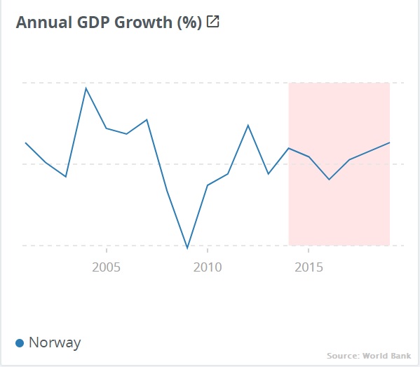 Después de un crecimiento del PIB en 2004-2007, la economía se ralentizó en 2008 y se contrajo en 2009, antes de volver a un crecimiento modesto y positivo entre 2010 y 2015. El colapso del precio del petróleo entre 2014 y 2016, sin embargo, ha tenido consecuencias dramáticas para la economía noruega: 50.000 personas –una quinta parte de la mano de obra de la industria– perdieron sus empleos y los ingresos estatales del sector cayeron un 40%. En paralelo, a lo largo de 2015 la crisis de los inmigrantes en Europa registró un récord de 31.000 solicitantes de asilo en Noruega, lo que provocó un sentimiento anti-extranjero y un fuerte endurecimiento de los controles de inmigración.