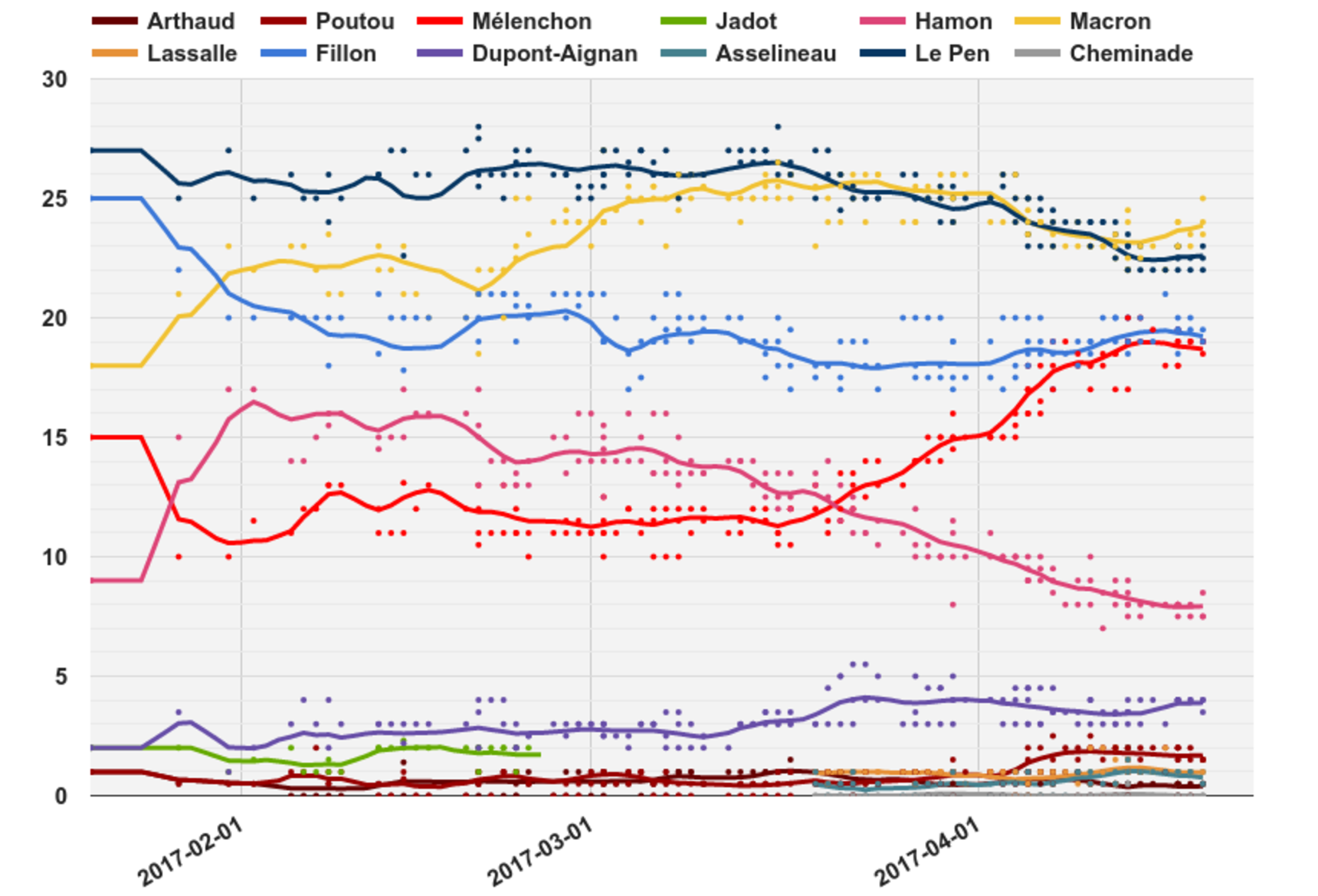 En la recta final de la campaña, el foco se ha desplazado de nuevo. Esta vez es Jean-Luc Mélénchon, el candidato del movimiento izquierdista La Francia Insumisa, el que irrumpe en el tablero, con un discurso crítico con la Unión Europa y la propuesta de abolir la “monarquía presidencial” que instauró la Quinta República. Mélenchon, que abandonó el Partido Socialista en 2008, inició la campaña con un 10% de intención de voto. El desplome del candidato socialista Benoît Hamon le ha aupado hasta casi el doble, dentro del margen de error para disputar el segundo puesto. Pánico en el establishment francés, que se ve asediado desde ambos lados del espectro político.