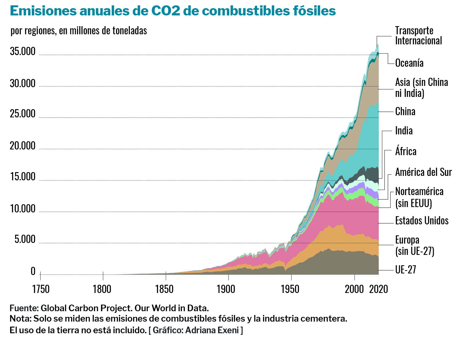 La deuda financiera palidece frente a la medioambiental, que es, de lejos, la más injusta y la menos sostenible, según escribe Mohamed Adow en Foreign Affairs. Desde comienzos de la revolución industrial, la atmósfera ha recibido unos 1,5 billones de toneladas métricas de dióxido de carbono de origen antrópico. Entre 1990 y 2020, las emisiones de gases de carbono aumentaron un 58%. Adow recuerda que las mayores emisiones acumuladas han provenido, en este orden, de EEUU, Europa, China y Rusia, países que pueden financiar una transición energética que les permita alcanzar la neutralidad de carbono (emisiones netas cero) hacia mediados de siglo. Desde 2015, la economía mundial ha crecido un 23%, pero las emisiones solo un 3%.