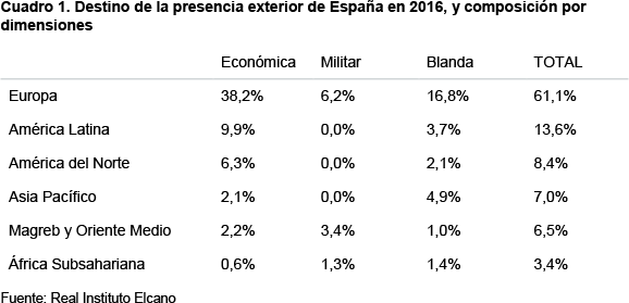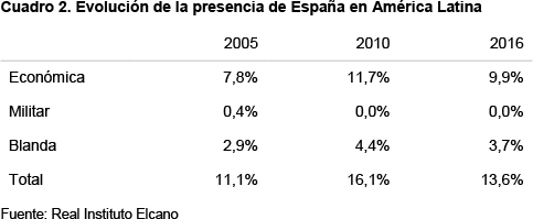 América Latina ocupa el segundo lugar dentro de la proyección global de la presencia española por detrás de Europa, y por delante de Asia y Pacífico (cuadro 1). Dicho de otro modo, España se proyecta fundamentalmente hacia Europa y América Latina. En concreto, en 2016, un 13,6% de la presencia de España hacia el resto del mundo era registrada en particular hacia la región latina (frente al 60% en Europa). Y dentro de ese 13%, casi 10 puntos porcentuales corresponden a la dimensión económica, y poco más de 3 a la blanda.