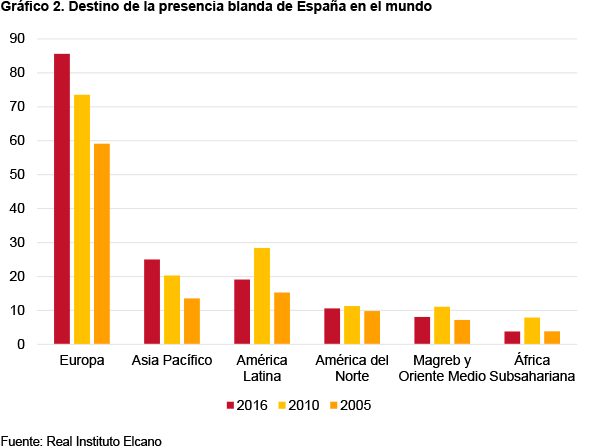 Aún con todo, asistimos a una fuerte pérdida de relevancia de los vínculos de presencia blanda entre España y América Latina. Es la región en la se produce la mayor pérdida de presencia blanda de España, ubicándose en 2016 tras Asia y Pacífico. Revertir la tendencia no es cuestión sencilla debido precisamente al carácter de dichos vínculos y a su relación con indicadores económicos, y ninguna de las dos orillas del Atlántico atraviesa actualmente sus mejores momentos a este respecto.