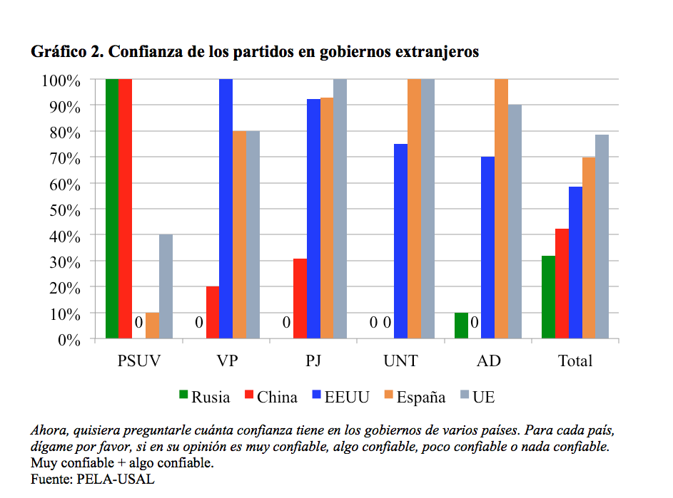 En el gráfico 2 se muestra el grado de confianza que tienen los diferentes grupos parlamentarios en gobiernos extranjeros. El PSUV tiene el máximo grado de confianza hacia Rusia y China, a diferencia de la oposición, que en algunos casos no muestra ningún tipo de confianza hacia el gobierno de Rusia, ni Primero Justicia (PJ), ni Voluntad Popular (VP), ni Un Nuevo Tiempo (UNT), y la confianza también es nula hacia el gobierno chino por parte de Acción Democrática (AD) y UNT. Sí están bien valorados el gobierno estadounidense (Barack Obama era el presidente entonces) y la UE por parte de la oposición. Cabe resaltar los niveles elevados de confianza en el gobierno de España (con Mariano Rajoy al frente del ejecutivo por entonces), que junto con los de la UE, supera a EEUU en todos los grupos, salvo en el caso de VP que confía plenamente en el gobierno estadounidense. El gobierno español no es el que goza de mayor confianza entre todos los diputados por la poca confianza que genera entre el PSUV (10%), no así la UE que alcanza el 40%. Por otro lado, resulta revelador comprobar que el PSUV confía más en los gobiernos de Rusia y China que la oposición en los gobiernos de EEUU, UE y España.