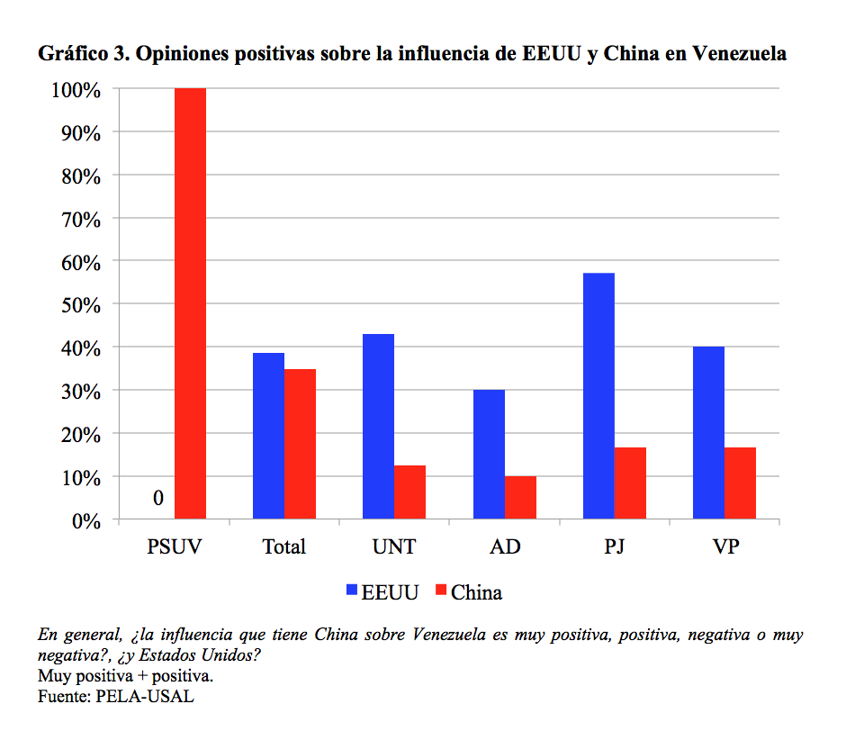 Finalmente, en el gráfico 3 se refleja la influencia que tienen EEUU y China en Venezuela (esta vez sin referirse a los gobiernos). El PSUV sigue otorgando a China la máxima consideración con opiniones positivas o muy positivas hacia su influencia en Venezuela, mientras que no hay un solo diputado chavista que crea que la influencia de EEUU es, al menos, positiva. La oposición sigue el patrón inverso al PSUV, pero no acaba de valorar tan positivamente la influencia de EEUU en Venezuela como sí hace el PSUV con China. De hecho, tan sólo PJ supera el 50% de opiniones positivas hacia EEUU.