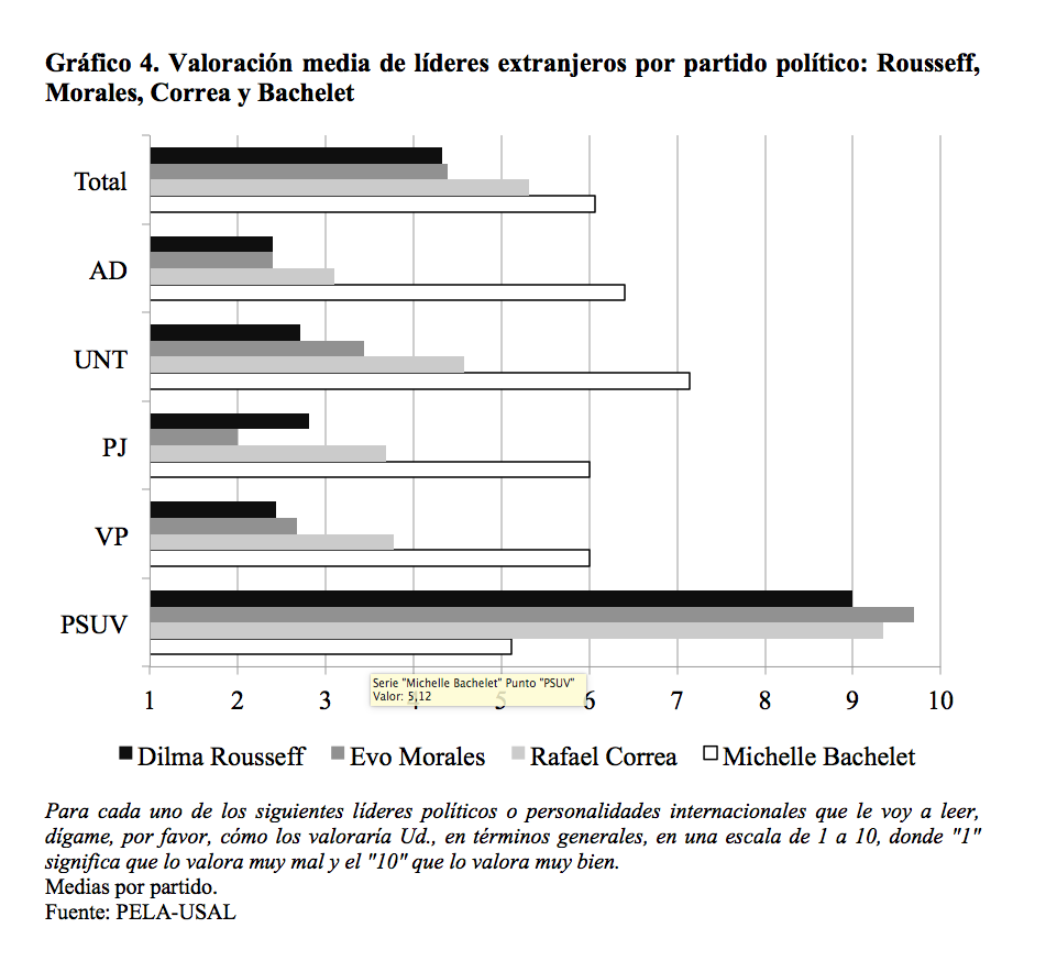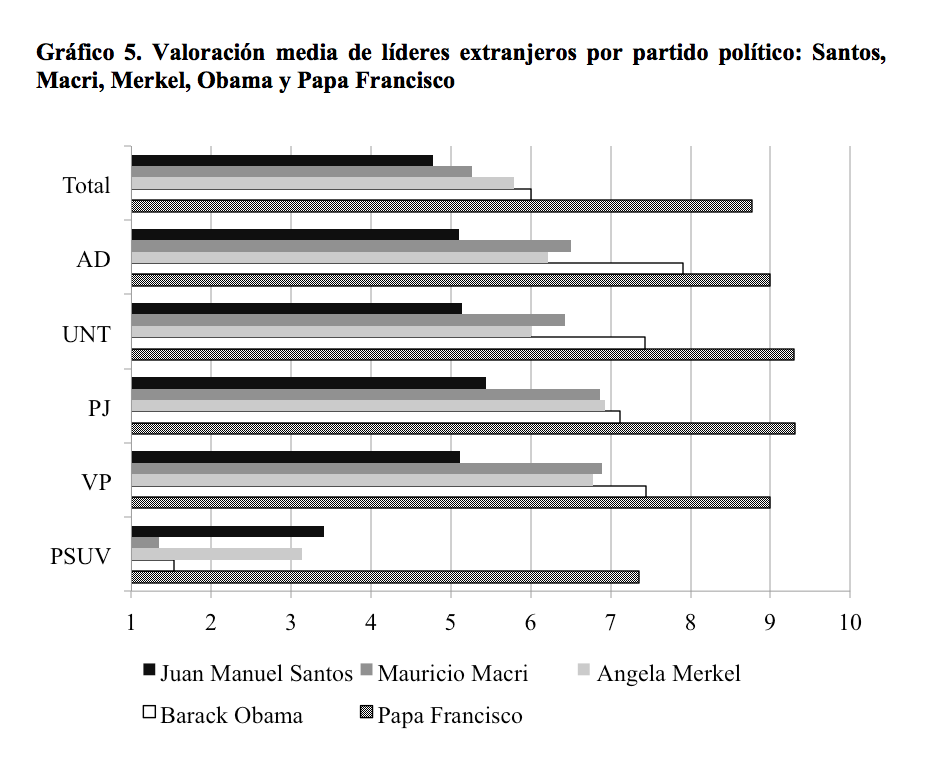 En los gráficos 4 y 5 se presenta la valoración media de líderes extranjeros por cada partido político. La mayoría de los líderes de izquierda latinoamericana son muy bien valorados por el PSUV. A pesar de que Michelle Bachelet tiene una nota positiva por parte del PSUV, es la líder política que obtiene una calificación más baja dentro del espacio de la izquierda, aunque genera consenso entre las diversas fuerzas parlamentarias venezolanas. Aun así, el líder que mayor valoración obtiene por parte de todos los grupos es el papa Francisco, siendo el líder mejor valorado por el total de los diputados entrevistados con casi un 8,77 de media. Se aprecia un claro contraste entre la opinión de los grupos de la oposición, que valoran positivamente a líderes como Angela Merkel, Mauricio Macri o Barack Obama y el PSUV, que le otorga puntuaciones muy altas a los líderes del giro a la izquierda: Rafael Correa, Evo Morales y Dilma Rousseff. Un caso paradigmático es el de Juan Manuel Santos que no es tan bien valorado por la oposición venezolana ni tan mal por el PSUV.