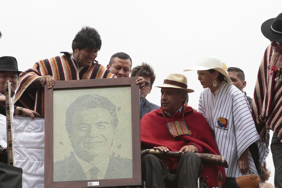 El presidente de Bolivia, Evo Morales, obsequia al de Ecuador, Lenín Moreno, con un retrato de este último, durante una ceremonia en el parque arqueológico de Cochasquí, en Ecuador, el 25 de mayo de 2017. GETTY