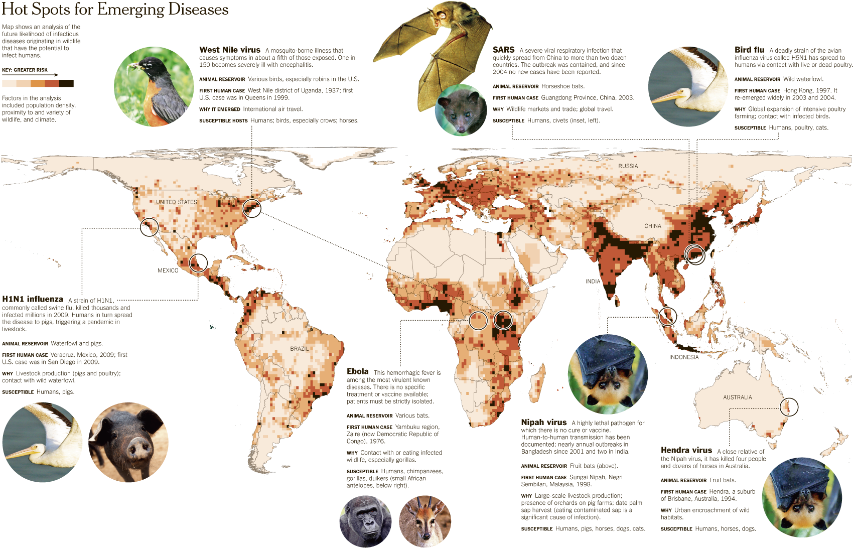 Entre el 60% y el 75% de las enfermedades infecciosas emergentes –SARS, ébola, sida, zika, la fiebre del Rift, la enfermedad de Kyasanur…– tienen origen zoonótico. En 1998, un grupo de malayos dedicado a la cría de cerdos comenzó a tener síntomas –fiebres, convulsiones– de una enfermedad desconocida que contagió a 265 personas. Murieron 105, una tasa de mortalidad del 40%. Según cuenta un reportaje de The New York Times, un año después Kaw Bing Chua, virólogo de Universidad de Malasia, llevó unas muestras del patógeno al Centro de Control y Prevención de Enfermedades (CDC) de Colorado para examinarlo en uno de sus potentes microscopios electrónicos. Chua descubrió que no era encefalitis sino un nuevo virus al que llamó Nipah, por el nombre de la aldea donde se encontró.