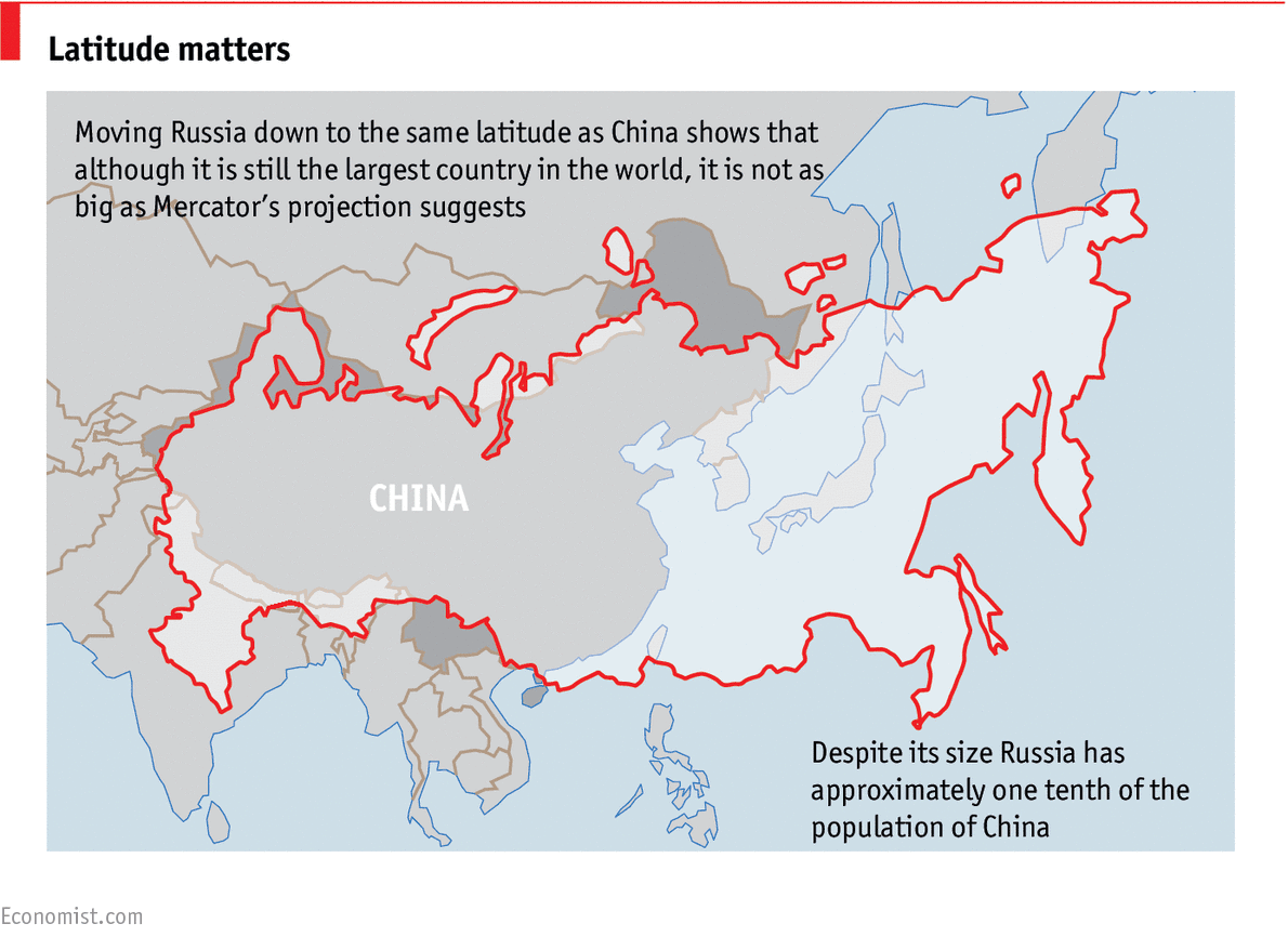 Pero hasta las realidades virtuales tienen consecuencias políticas reales. Las proyecciones del geógrafo y cartógrafo holandés Gerardus Mercator (1512-1594) se usan hasta hoy pese a que describen, entre otras cosas, una Groenlandia del tamaño de África o Brasil, cuando en realidad en el continente africano caben hasta 14 Groenlandias. En la escala Mercator, Rusia parece cubrir casi la mitad del globo, cuadruplicando la superficie de China o Estados Unidos. En realidad, con 17,1 millones de kilómetros cuadrados, Rusia no duplica siquiera el territorio de ninguno de ellos.