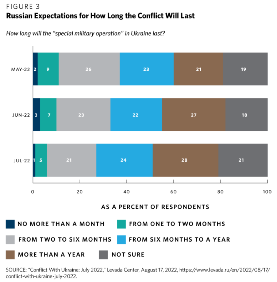 Cuanto más tiempo pasa, más se aleja la opinión pública rusa de lo que está ocurriendo. El conflicto se está convirtiendo en una guerra lejana, y la gente está cada vez más convencida de que los combates continuarán durante otros seis meses o incluso más (véase la figura 3).