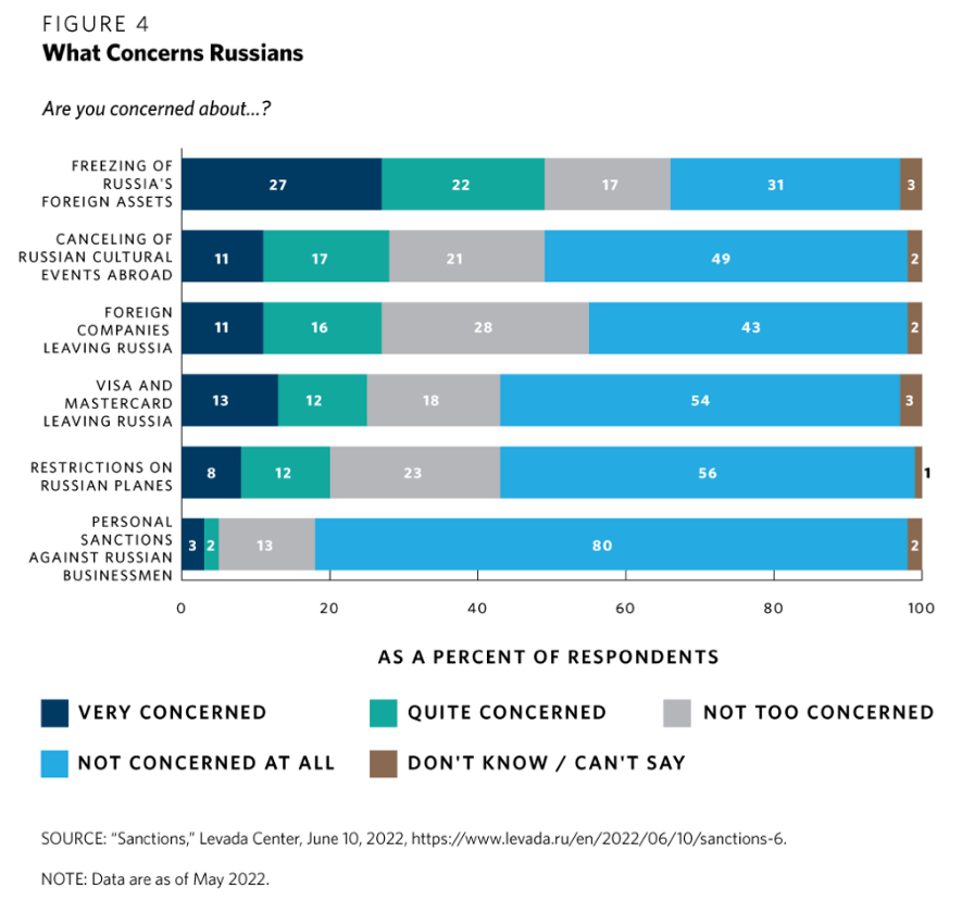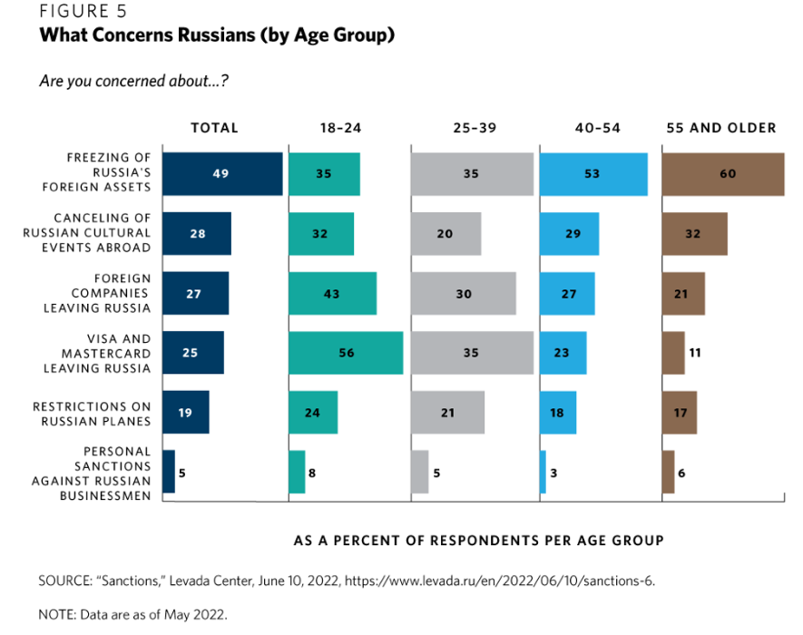 Al principio, la ampliación de las sanciones occidentales contra Rusia provocó una nueva oleada de ansiedad entre el público ruso. En marzo, el 46% de los encuestados dijo estar preocupado por las sanciones occidentales, lo que supone un aumento de 14 puntos porcentuales respecto a finales del año pasado. El 29% de los rusos dijo que las sanciones ya habían creado graves problemas a sus familias, un aumento del 19% en comparación con la última encuesta realizada dos años antes. Los residentes de las grandes ciudades, los jóvenes y los encuestados con menos recursos económicos fueron los más propensos a hablar del impacto de las sanciones en su familia, aunque sintieron los efectos de diferentes maneras. Las personas más pobres estaban más preocupadas por la inflación y el aumento del coste de la vida. Los jóvenes se mostraron más preocupados por el éxodo de las marcas extranjeras y el fin del acceso a los comercios online extranjeros.