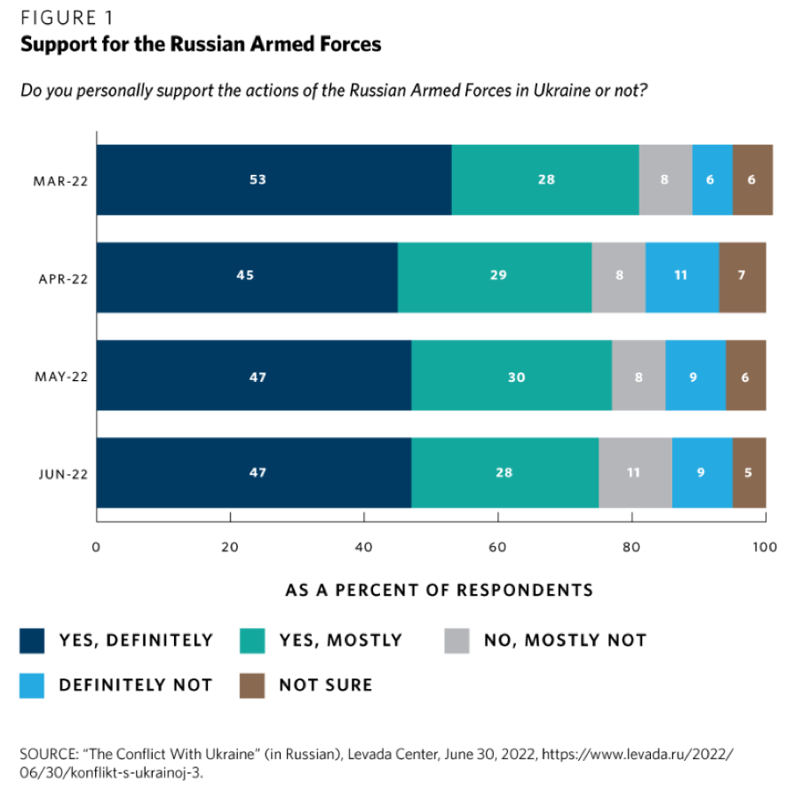 Las encuestas de opinión muestran sistemáticamente que la mayoría de los encuestados apoyan las acciones de las fuerzas armadas rusas en Ucrania. La magnitud de ese apoyo ha cambiado poco durante los primeros cuatro meses de la guerra. Pero el conjunto de personas que expresan su apoyo a lo que Moscú llama la “operación especial” y al propio Putin no es en absoluto homogéneo. (Por regla general, los partidarios de Putin tienden a apoyar la campaña militar). En junio de 2022, el 47 por ciento de los rusos “apoyaba definitivamente” las acciones de los militares rusos, mientras que otro 28 por ciento decía que las apoyaba “mayormente”.