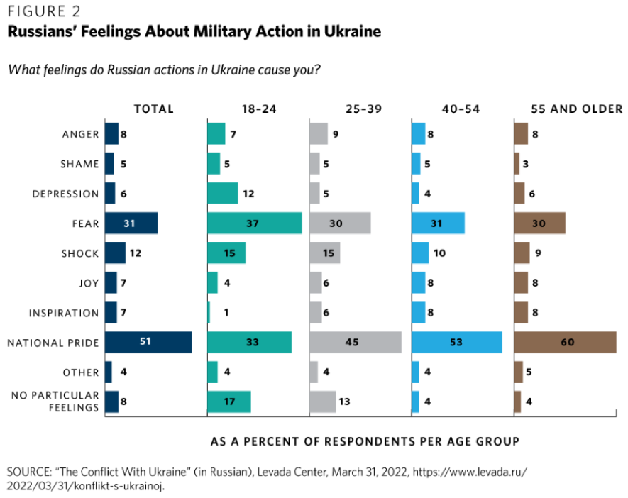 En el segundo grupo, es decir, los que “apoyan mayoritariamente” las acciones de Rusia en Ucrania, el nivel de apoyo es menos decidido. Hay más dudas sobre si lo que está ocurriendo es correcto o no y sobre la base de las acciones del Kremlin. En comparación con el grupo que ofrece un apoyo incondicional, las personas del segundo grupo eran dos veces más propensas a expresar sentimientos de ansiedad, miedo y horror por lo que está sucediendo. También es mucho menos probable que expresen orgullo. Para ellos, la “operación especial” está motivada sobre todo por el deseo de proteger a lo que los rusos describen como la población rusoparlante de Ucrania. El apoyo a las acciones del gobierno ruso es algo menor en este grupo. Las convicciones de este grupo suelen estar menos definidas, y se inclinan por seguir simplemente la opinión pública dominante y la línea oficial. Es probable que algunos de estos encuestados digan que apoyan a los soldados rusos por miedo a las consecuencias adversas para ellos mismos. Pero no hay que exagerar el número de estos individuos (véase la figura 1).