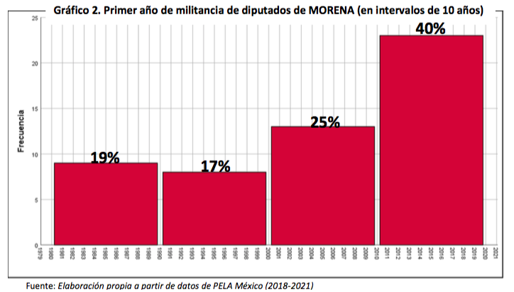Por otro lado, casi un 40% de los diputados inició su trayectoria política en los últimos ocho años, y para el 47%, su primer partido político de militancia fue Morena.