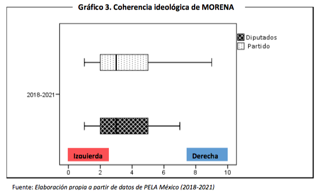 No obstante, a partir de las elecciones de 2018, Morena ha desplazado al PRD del espacio ideológico de izquierda. Es importante tener en cuenta que en las elecciones presidenciales del 2018, el PRD formó parte de la Alianza “Por México al Frente” junto al PAN y Movimiento Ciudadano, dos partidos tradicionalmente de derecha y centroderecha, respectivamente. En cuanto a su estructuración ideológica, tanto la posición de los diputados como la que éstos le atribuyen a su partido coinciden, en promedio, cercanos al valor 3, es decir, con tendencia hacia la izquierda. Sin embargo, a pesar de que las medias convergen, hay mayor dispersión de respuestas en la ubicación del partido. En otras palabras: hay menor grado de acuerdo sobre donde ubicar la identidad ideológica de su partido que entre la propia auto ubicación ideológica de los diputados.