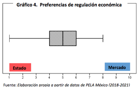 Por otro lado, en lo que respecta a sus preferencias sobre modelos de regulación económica, podemos apreciar que, en promedio, los diputados de Morena se encuentran casi en la posición 5. Es decir que, en el plano económico, no serían totalmente estatistas, sino que se ubicarían más cercanos al centro.