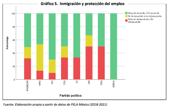 Asimismo, se les preguntó cuánto de acuerdo estaban con la afirmación “cuando el empleo escasea, los mexicanos deben tener prioridad sobre los inmigrantes en el acceso a un puesto de trabajo”. La mitad de ellos parece estar de acuerdo o muy de acuerdo (51%), mientras que el 32% decía estar en desacuerdo o muy en desacuerdo. El resto de diputados morenistas no tenían clara su postura y afirmaron no estar ni en acuerdo ni en desacuerdo. Esta división se repite en el otro partido de centroizquierda, PRD, mientras que, llamativamente el Partido del Trabajo (PT) está mayoritariamente de acuerdo, al igual que el PAN y el PRI, con esta visión nacionalista de acceso al empleo.