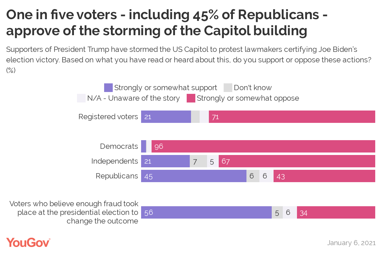 El 3 de noviembre, Trump obtuvo más de 74 millones de votos, casi ocho más que en 2016. Según un sondeo de diciembre de YouGov, un 39% cree que las elecciones fueron fraudulentas. Antes de los disturbios, un 75% de sus votantes decía que Trump no debía conceder la derrota. El 45% aprobó el asalto. La gran mayoría (90%) quiere que sea el candidato del partido en 2024.