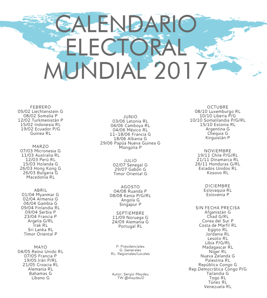El calendario electoral internacional de 2016 prometía emociones fuertes y, visto el resultado, se confirmaron las previsiones, salvo sorpresas inesperadas. Las elecciones que en 2016 se sucedieron en Filipinas, Austria, Gambia, Australia, Nicaragua, Níger o Estados Unidos, por poner algunos ejemplos, pusieron sobre la mesa algunos de los debates políticos, sociales y económicos actuales: la gestión de los flujos migratorios; el avance de la extrema derecha; la crisis de la socialdemocracia; la implementación de políticas de seguridad reactivas; el aumento de los movimientos de protesta ciudadana; la integración europea; el control por los recursos naturales, y la geopolítica, por citar algunos de los más relevantes. Estos tuvieron una influencia decisiva en varias de las citas electorales de 2016 y son, desde luego, elementos a tener en cuenta a la hora de analizar el calendario electoral de 2017.