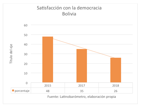 Para entonces la percepción que la ciudadanía tenía sobre la democracia ya estaba deteriorada. El informe de Latinobarómetro señalaba que entre 2016 y 2018 el índice de satisfacción con la democracia en Bolivia estaba en franco descenso: