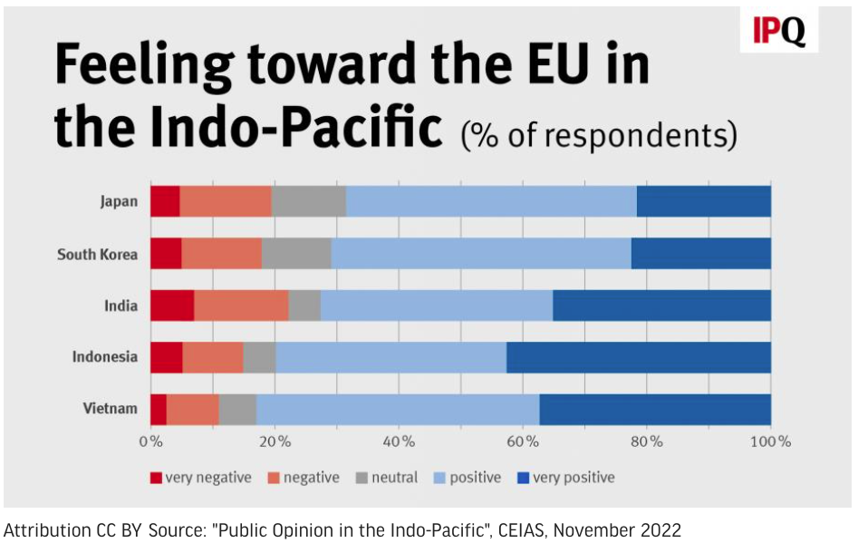 Todo esto es motivo de alegría en Bruselas, que está decidida a aumentar su presencia en el Indo-Pacífico. Y coincide con las conclusiones de otros estudios. Una encuesta del Pew Research Center, realizada esta primavera pero publicada este mes, también reveló que la UE tiene una opinión favorable en general en el Indo-Pacífico; más de dos tercios de los australianos y surcoreanos la consideran positiva, al igual que más de la mitad de los japoneses, singapurenses y malayos. Y coincide en líneas generales con las encuestas anuales de opinión de las “élites” del Sudeste Asiático realizadas por el Instituto ISEAS-Yusof Ishak de Singapur.