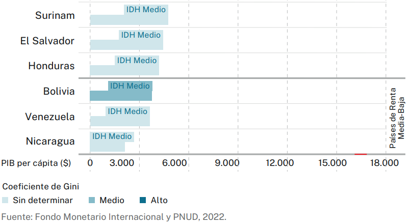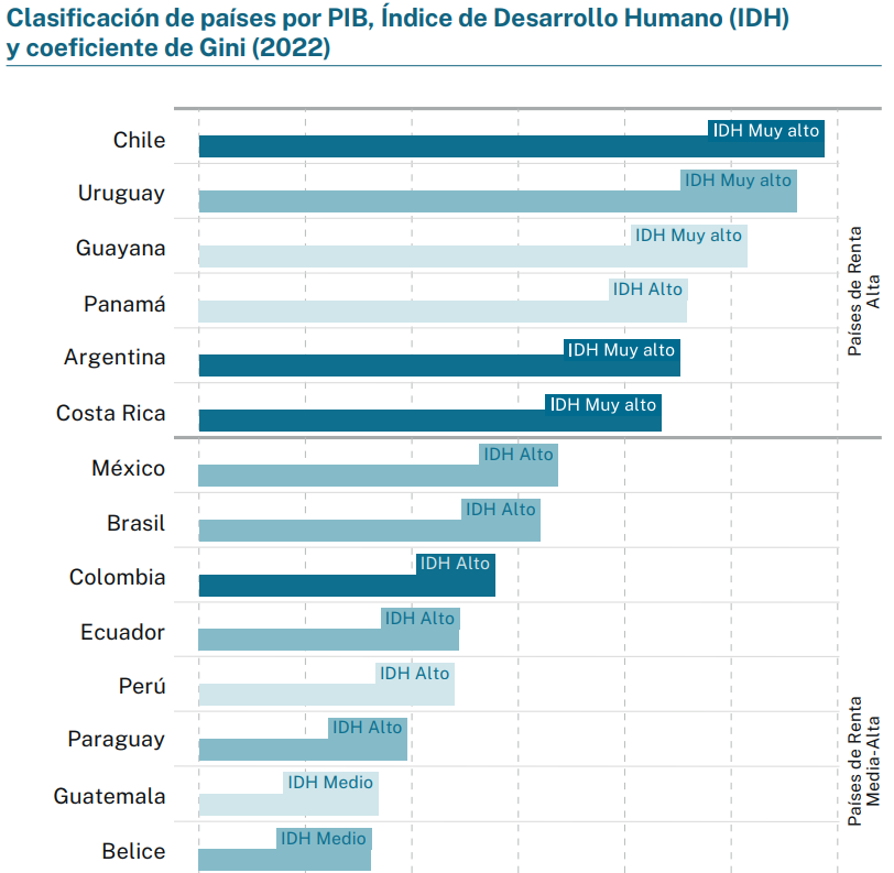 Además, se considera insuficiente este parámetro para calificar la situación de un país determinado, asociándole otros indicadores como el Índice de Desarrollo Humano (IDH, según Amartya Sen) que toma en cuenta la esperanza de vida, el nivel de educación, junto a la distribución del PIB corregido por el poder adquisitivo de cada país (PPA) o la distribución de esa riqueza mediante, por ejemplo, el Coeficiente de Gini (CG, según Corrado Gini), ambos también con sus complejidades e inequidades. La gran mayoría de los países de Latinoamérica (excluido Caribe), se ubica en la denominada renta media. Solo tres países, Bolivia, Nicaragua y Venezuela, se ubican en la renta media-baja y siete países se ubican por encima del límite de renta alta, pero cuatro de ellos, Panamá, Argentina, Costa Rica y Guyana, presentan valores apenas por encima del límite inferior de la categoría. De estos últimos, el más estabilizado en esta situación es Chile, y el más recientemente incorporado es Guayana. Entre los demás países de la región México, Brasil, Colombia y Perú, son los de mejor desempeño en los últimos años, incidiendo en ello el tamaño de sus economías y la población.