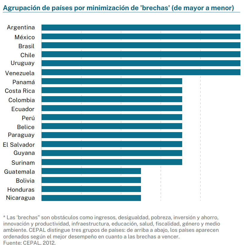 En general, el IDH no es malo en la región, pudiendo decirse que está entre alto y medio, y lo mismo ocurre con la distribución del ingreso según Gini. Otro aspecto a valorar son las denominadas “brechas”. La CEPAL definió en 2012 una serie de brechas que serían los obstáculos a superar como el ingreso, la desigualdad, la pobreza, la inversión y ahorro, la innovación y productividad, la infraestructura, la educación, la salud, la fiscalidad, el género y el medio ambiente. En este caso, y haciendo un análisis global de todas las brechas, se pueden distinguir tres grupos de países.