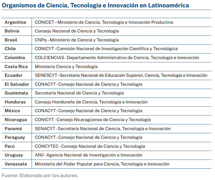 En los países de latinoamericanos los sistemas de ciencia y tecnología, si bien difieren, en general muestran patrones concordantes. Se trata de consejos o agencias oficiales, que atienden las inversiones en el área, promueven las investigaciones y los cuadros de científicos y técnicos, propendiendo a cubrir necesidades y vacantes en determinados aspectos e intereses de cada país.