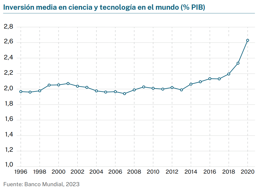 Según datos del Banco Mundial, la media mundial en los últimos 20 años es superior al 2% del PIB, y desde 2017 se verifica un incremento sostenido, llegando a una media superior al 2,6%. Es muy superior en EEUU, Alemania, Austria y Bélgica, con una media por encima del 3,3% y más aún en Corea del Sur, Japón, e Israel, con medias del orden del 4,5% del PIB. Por su parte España, Italia, Canadá y Francia tienen un promedio de 1,5%, ligeramente por debajo del promedio mundial.