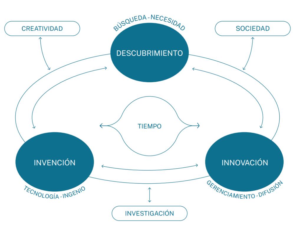 El círculo que vincula el Descubrimiento, la Invención y la Innovación puede sintetizarse en la siguiente figura que relaciona el descubrimiento la invención y la innovación: En esa figura se aprecia la interrelación entre lo que se define como “descubrimiento”, es decir encontrar lo que existe para lo cual es necesaria la curiosidad y la necesidad de búsqueda, la invención, para lo cual es necesaria la ciencia, la tecnología, el ingenio y la creatividad, y finalmente la innovación, que precisa la gestión, el desarrollo y la inversión que resultará en la transferencia a la sociedad.