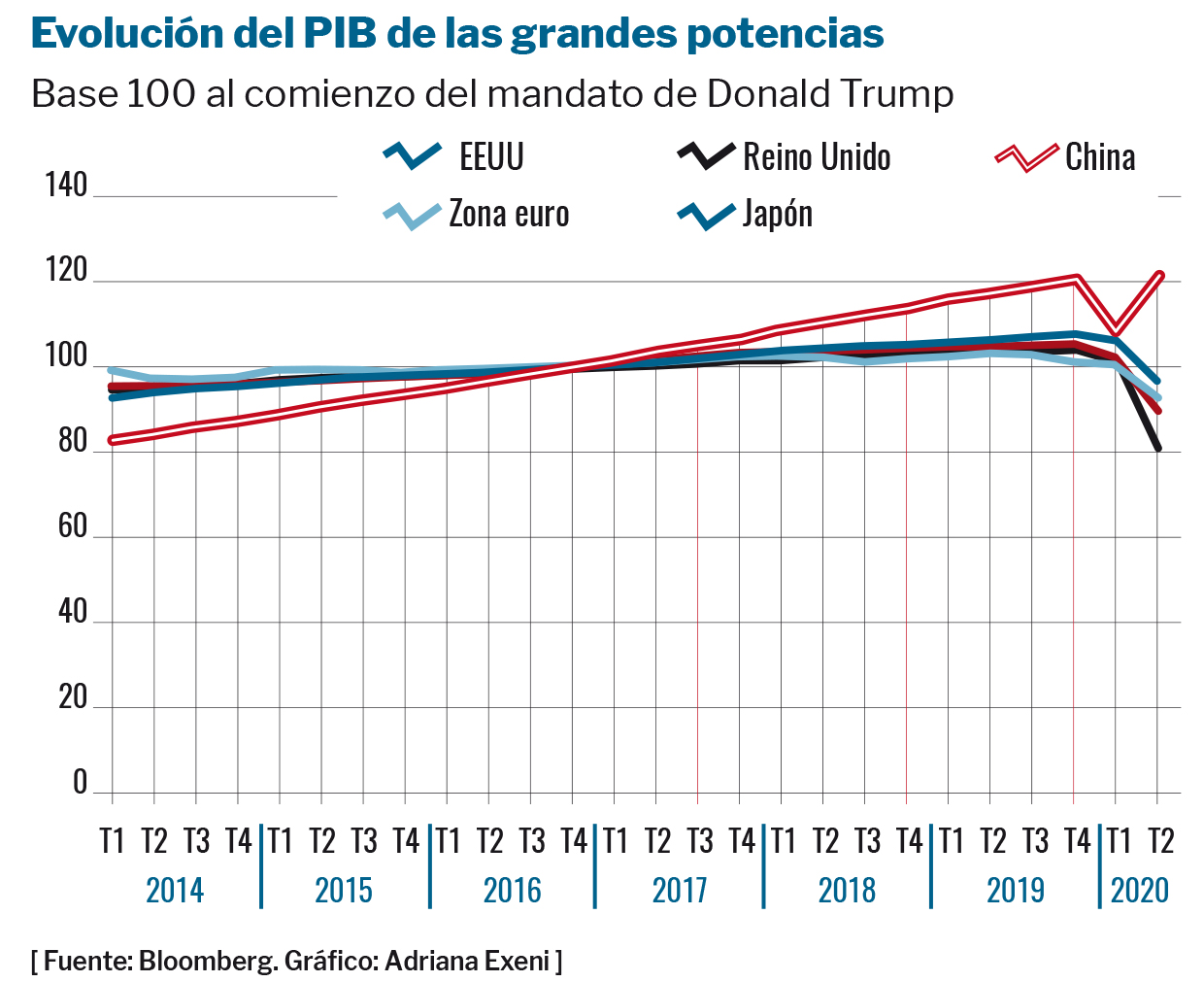 En casi cuatro años de mandato el presidente de Estados Unidos ha destacado por sus salidas de tono, dejando en segundo plano la gestión económica. Para Donald Trump, el alza en las bolsas es sinónimo de su éxito en este frente. Su mandato se saldaba con un resultado económico notable hasta marzo. Luego llegó la pandemia y todos los indicadores cayeron.