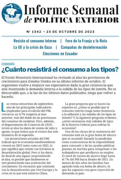 El Fondo Monetario Internacional ha revisado al alza las previsiones de crecimiento para Estados Unidos en su último informe de octubre. El organismo vuelve a mejorar sus expectativas dada la gran resistencia que está mostrando la demanda interna a la subida de los tipos de interés. No es descartable que, a la luz de los últimos datos publicados, tenga que volver a hacerlo.