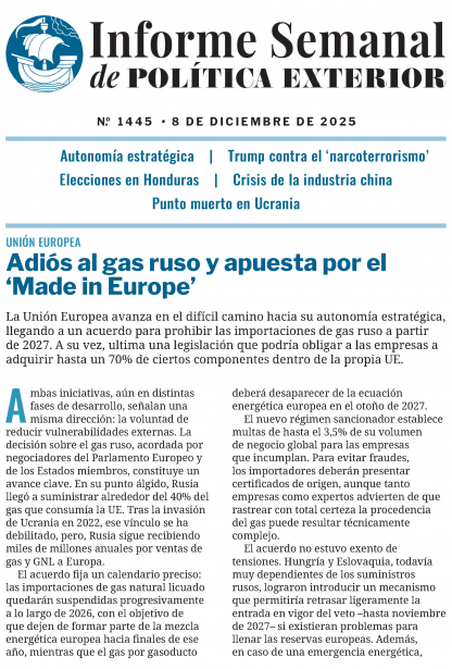 La Unión Europea avanza en el difícil camino hacia su autonomía estratégica, llegando a un acuerdo para prohibir las importaciones de gas ruso a partir de 2027. A su vez, ultima una legislación que podría obligar a las empresas a adquirir hasta un 70% de ciertos componentes dentro de la propia UE.