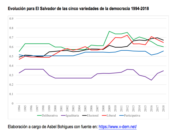 En paralelo, la descomposición de la democracia en cinco variedades permite afinar mejor sus componentes, además de dar cuenta de su evolución a lo largo de un cuarto de siglo, como se constata en el gráfico. Como es habitual para toda América Latina, la dimensión igualitaria de la democracia se descuelga de las otras cuatro, que además mantienen una suave pendiente creciente interrumpida en tres de ellas en torno a 2015