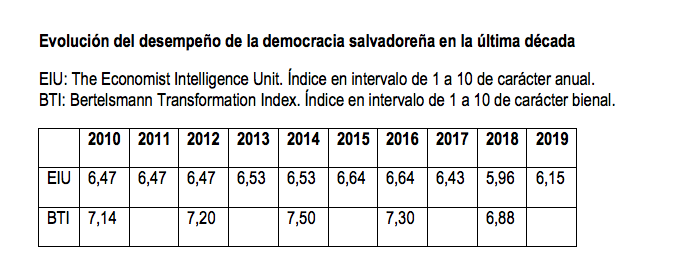 El panorama general institucional muestra que el sistema político salvadoreño tiene unas muestras de desempeño estable en un nivel ligeramente superior al promedio latinoamericano. El índice de Freedom House acerca de las libertades civiles y de los derechos políticos se mantiene constante en 2,5 (categoría de “libre”), mientras que los índices más complejos recogidos en la siguiente tabla muestran cierta esta estabilidad con una suave pendiente decreciente.