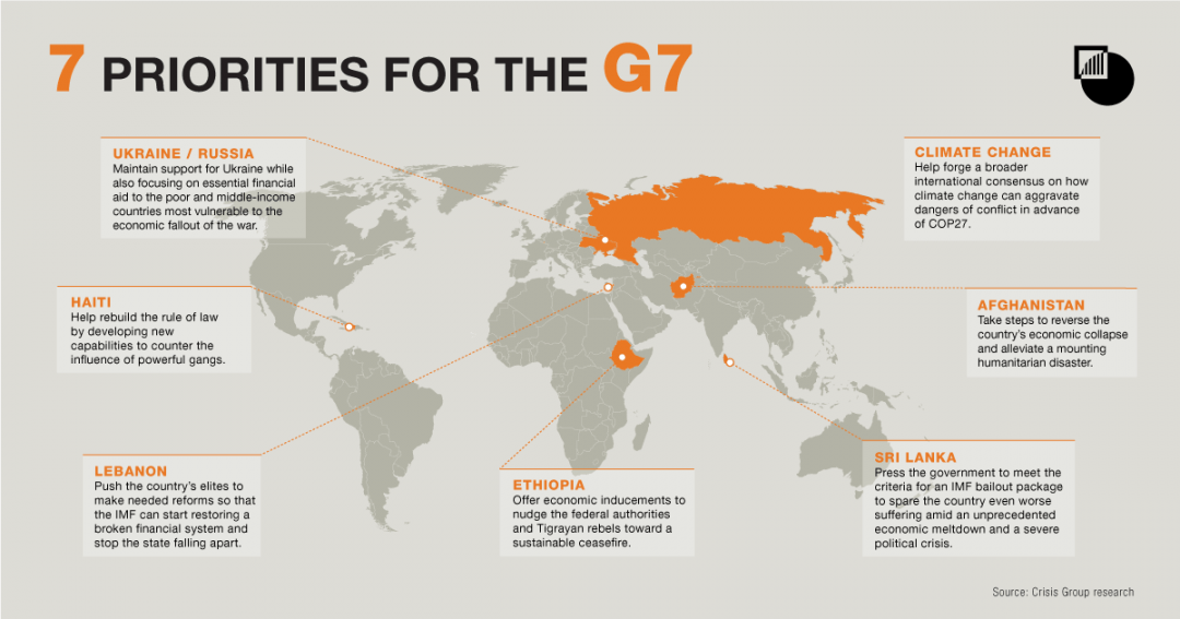 Aunque los líderes del G7 sin duda tomarán medidas contra Rusia por su agresión en Ucrania, también deben señalar al resto del mundo que se preocupan por otras crisis, especialmente por los problemas económicos generalizados. Muchos gobiernos de África, Asia y América Latina han condenado el asalto de Rusia a Ucrania. Pero también expresan su preocupación por el hecho de que Estados Unidos y sus aliados estén agravando la crisis económica mediante el uso de sanciones contra Moscú. Los funcionarios occidentales niegan tales acusaciones, y ciertamente Rusia, mediante su invasión y ocupación de parte de Ucrania, es la principal responsable de las ramificaciones de la guerra. Pero las sanciones han contribuido a la cascada de choques mundiales. Los líderes del G7 deben demostrar que escuchan las preocupaciones de los demás Estados y que pueden responder con eficacia. También deben dejar claro que, aunque Ucrania esté consumiendo la atención de las capitales occidentales, los esfuerzos para resolver otros conflictos y mitigar el sufrimiento que causan, especialmente a través del músculo financiero del G7, siguen estando en sus agendas.