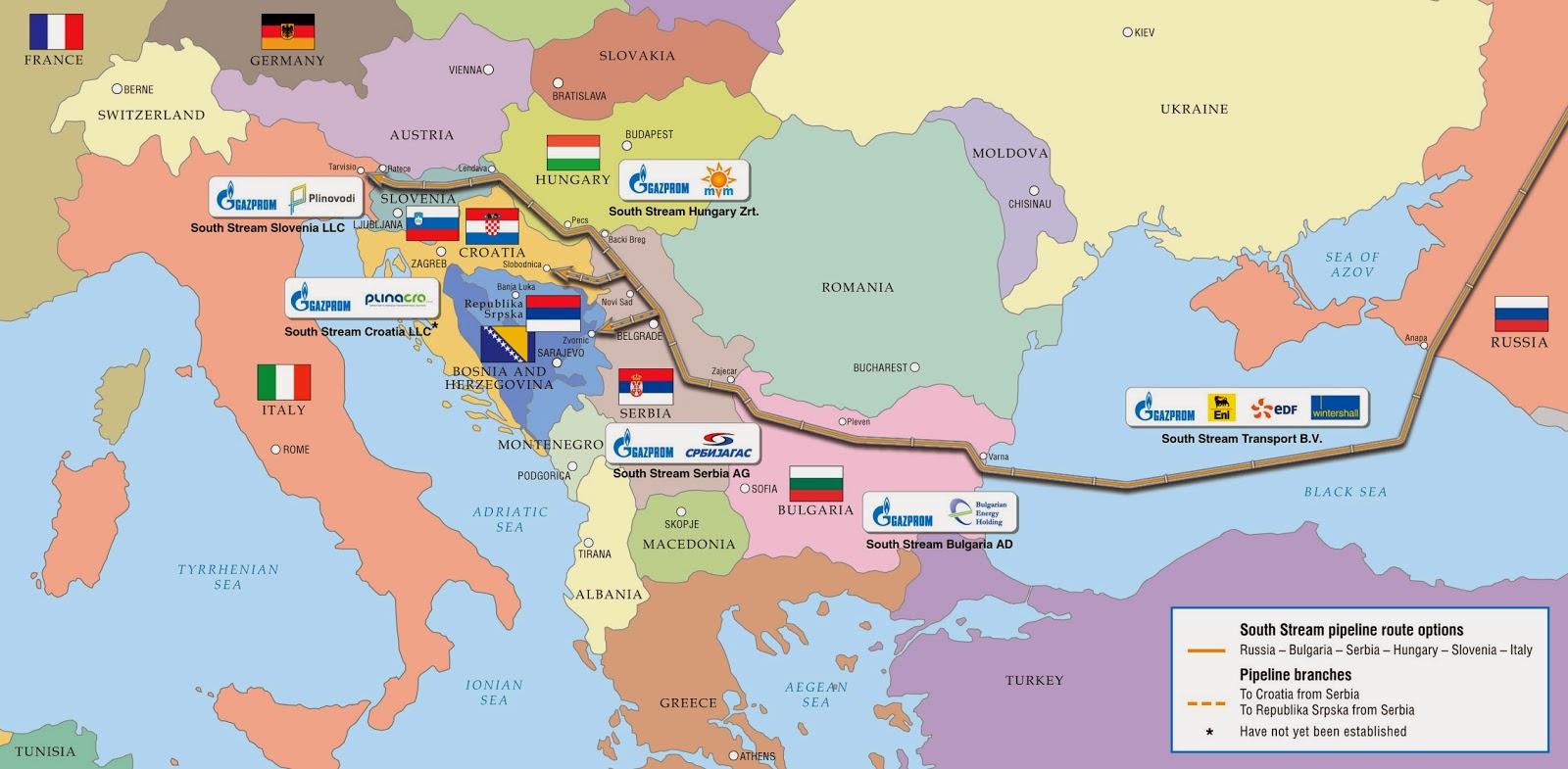 El gasoducto South Stream, cuyo coste previsto era de 45.000 millones de dólares, hubiera permitido exportar anualmente 63.000 millones de metros cúbicos de gas a Europa occidental a partir de 2018, conectando el puerto ruso de Beregovaya con el búlgaro de Burgas, bajo el lecho del mar Negro. Desde allí, conectaría con los mercados de Serbia, Hungría, Eslovenia e Italia.