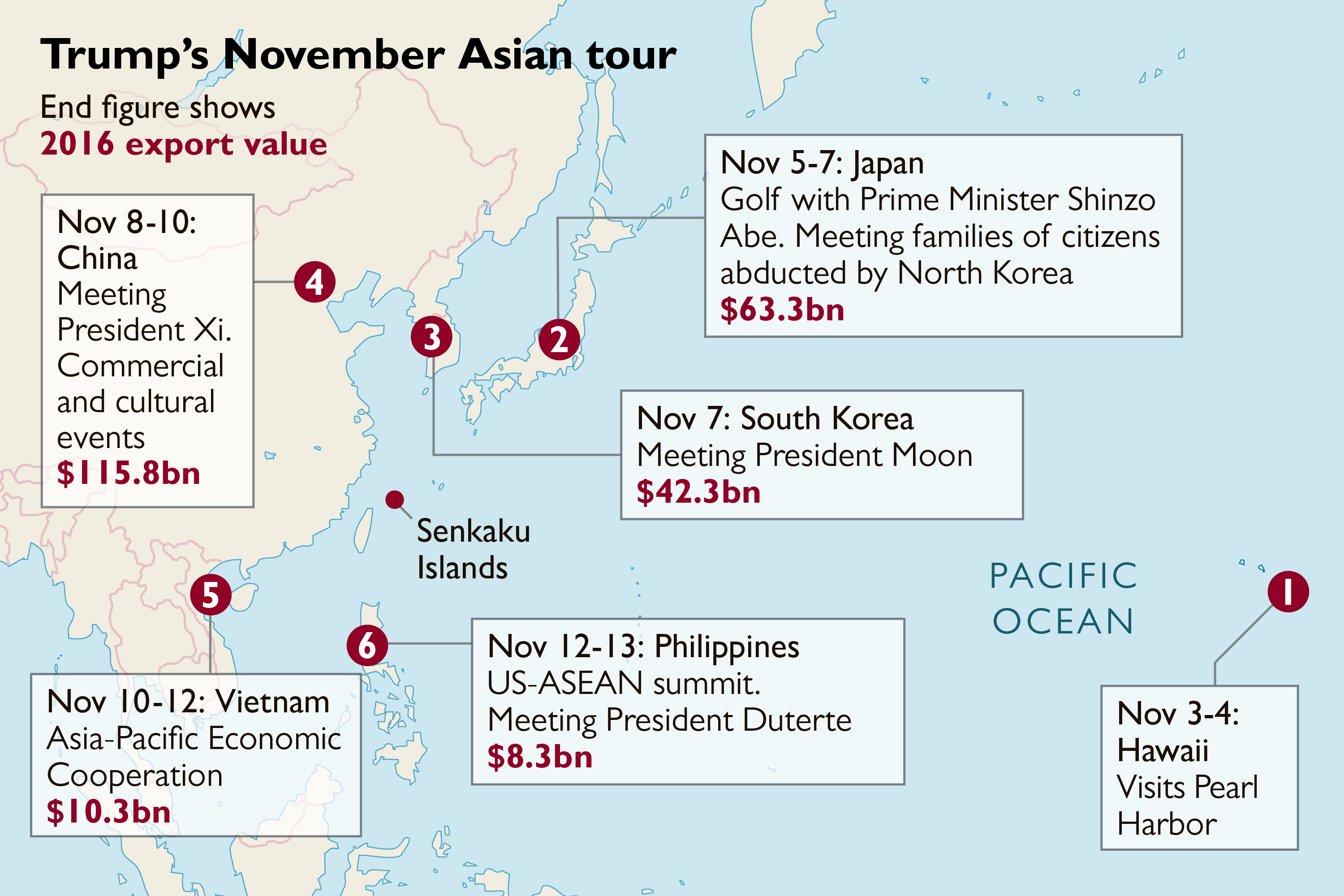 Hubo dos asuntos clave y en ninguno obtuvo Trump resultados concretos. Uno era lograr un compromiso más efectivo de China para presionar a Corea del Norte por su programa nuclear. El otro, mejorar los lazos comerciales con los países con los que tiene un gran déficit comercial tras el desplante de abandonar el Acuerdo Transpacífico de Cooperación Económica (TPP).